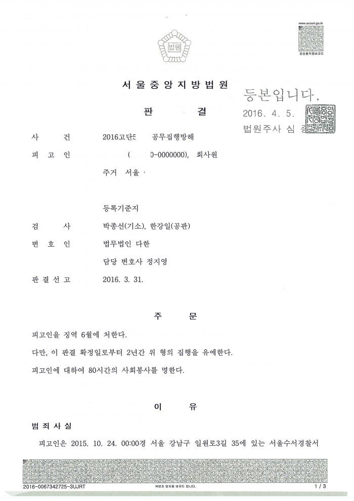 공무집행외에 폭행 및 업무방해 역시 같이 수사가 진행되었던 사건입니다.