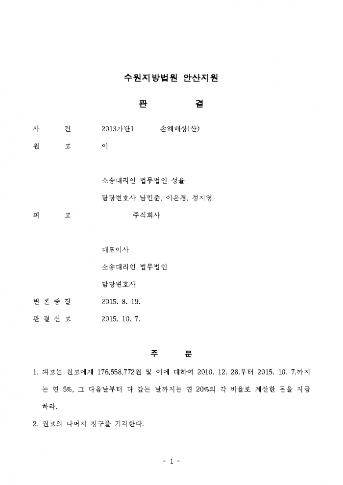 원고의 기계조작실수로 사고가 난 것으로 저에게 소송 당시 뚜렷한 회사의 과실을 찾지 못한 상태였으나, 증인신문을 통해 그동안 알지 못하였던 회사의 뚜렷한 과실을 찾아내었으며 외관법리를 주장해 상호속용을 인정받은 사건입니다.